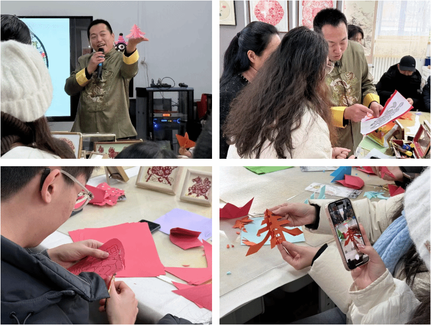 本次活动特别邀请天津市宝坻剪纸代表性传承人杨洪顺老师亲临指导。杨老师不仅分享了自己多年钻研剪纸的心得,还现场展示了精湛的剪纸技艺。随着他手中的剪刀灵巧翻飞,普通的红纸顷刻间化为栩栩如生的花鸟、寓意美好的“福”字。在杨老师手把手的指导下,在场的师生们纷纷拿起剪刀,折叠、剪刻……专注的神情中透着新奇与喜悦。当一张张独一无二、充满创意的剪纸作品在手中绽放时,成就感与欢笑声充满了整个艺术空间。