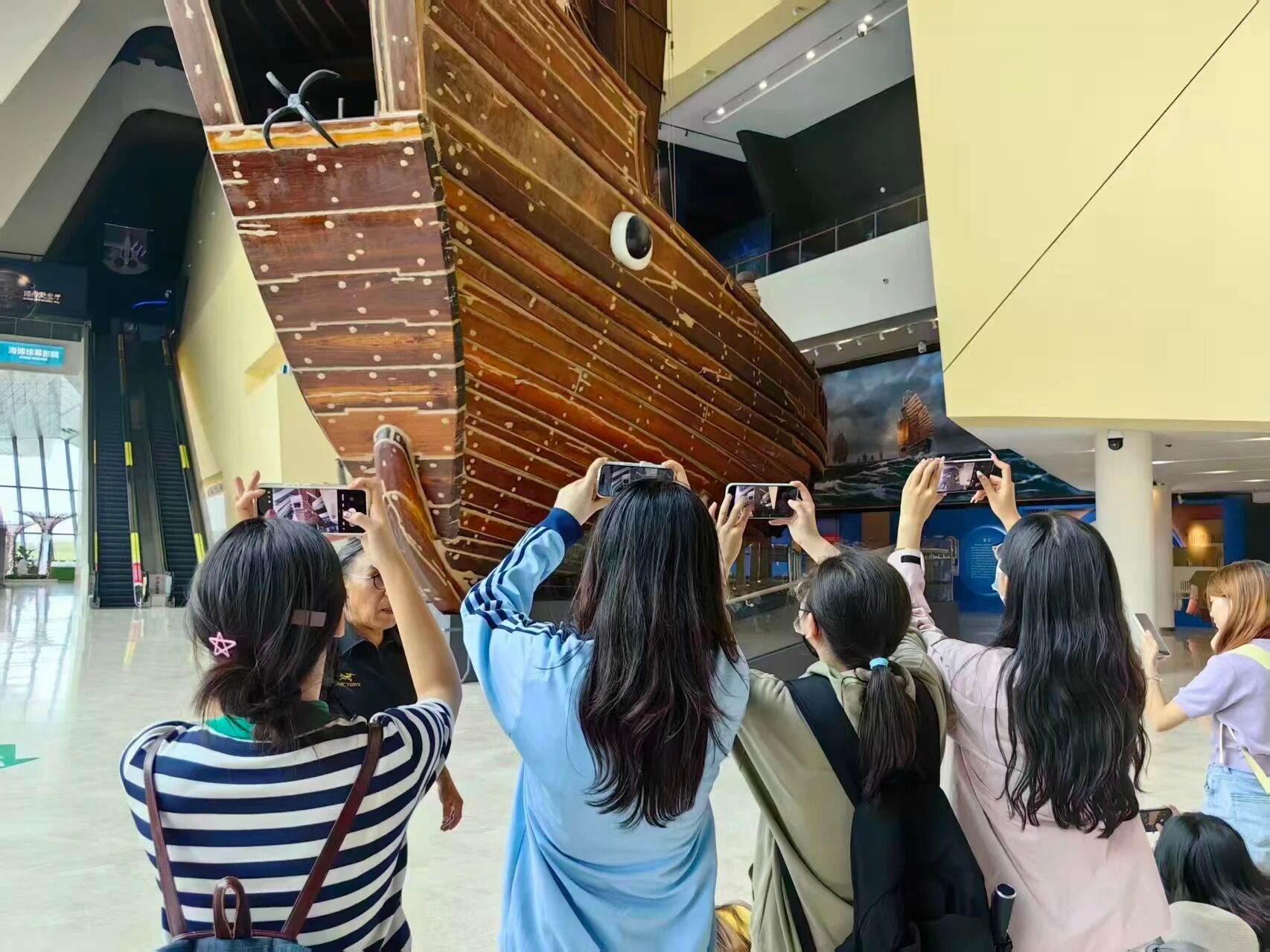 随后,大家乘车前往国家海洋博物馆开展拍摄实践。过程中,曹老师边操作边向学生拆解技巧:从如何跳出常规视角找拍摄角度,到怎样精准捕捉光影与空间的微妙关系,把自己对美的感知与拍摄经验,手把手教给身边的学生。